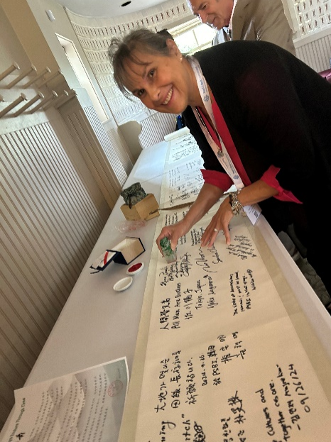 镇江市赛珍珠研究会献礼赛珍珠国际六十周年庆典的六米长卷“青山不老,大地长存”书法作品在会场展出,成为瞩目的焦点。与会嘉宾竞相在长卷留白处留言签名,以表达对赛珍珠女士的深切怀念与崇高敬意。本次会议受到了学术界、文化界和媒体的广泛关注。访美期间,卢章平会长接受了美国“优视频道”采访,唐其光馆长也接受了“凤凰卫视”的采访。