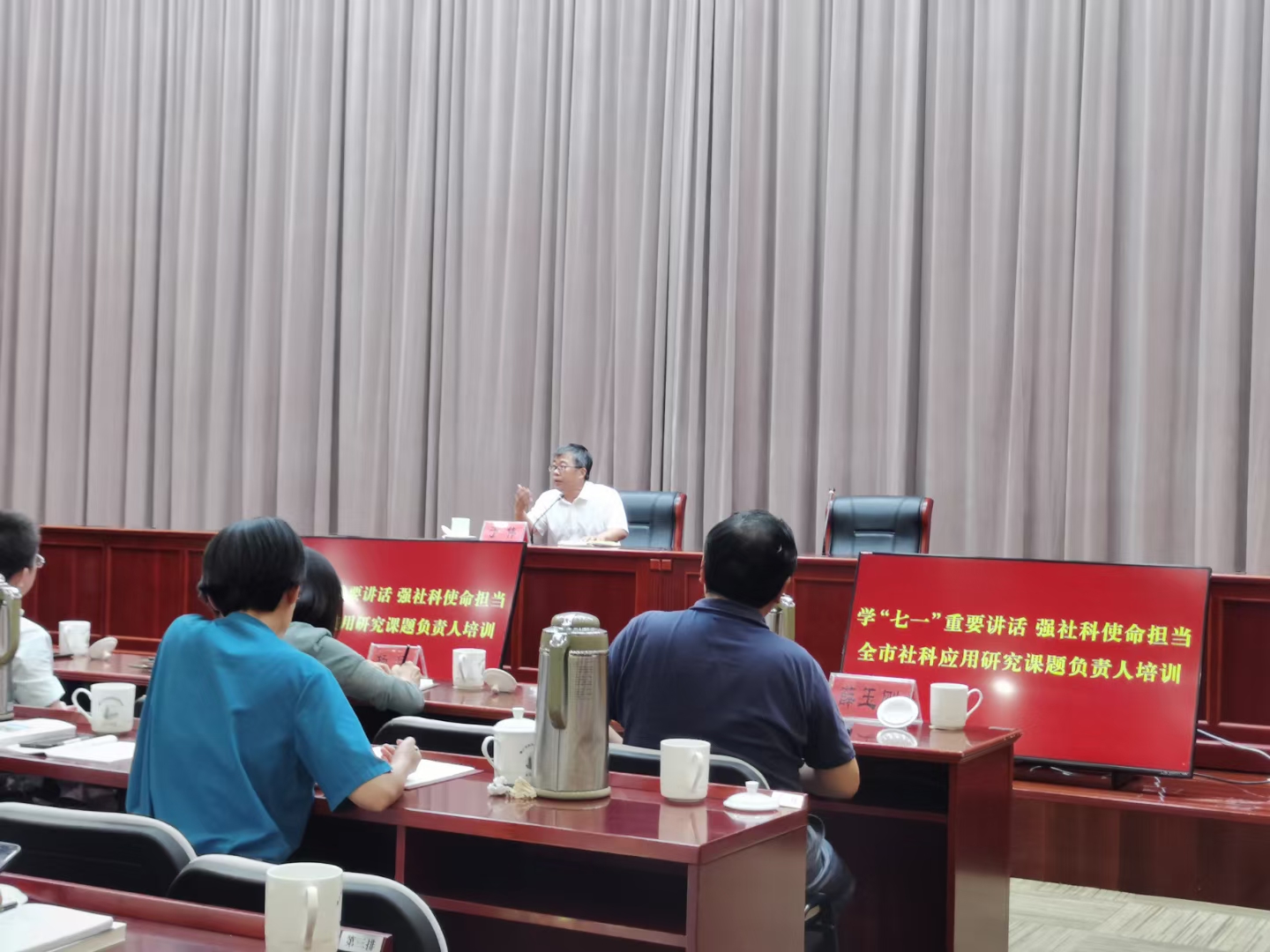 为深入学习习近平总书记在庆祝中国共产党成立 100 周年 大会上的重要讲话,贯彻落实习近平总书记关于哲学社会科学 系列重要指示,高质量推进全市社科应用研究工作,不断提高 课题研究人员研究能力,提升社科应用课题研究质量,7 月 9 日镇江市赛珍珠研究会组织赛珍珠研究专项课题负责人参加了镇江市社科联举办的全市社科应用研究课题负责人培训。镇江市政协提案委员会原主任顾大福、省社科联社科研究中心主任徐军海分别就如何开展调查研究及报告撰写做了三个多小时的讲座。市社科联主席于伟要求所有课题负责人认真学习习近平总书记“七一”讲话,深入扎实推进社科应用性研究,服务城市发展。市社科联副主席刘业林、杨猛、薛玉刚及 2021 年度社科应用研究一般课题和赛珍珠、大运河、法学专项立项课题负责人或课题组主要成员等参加了培训。