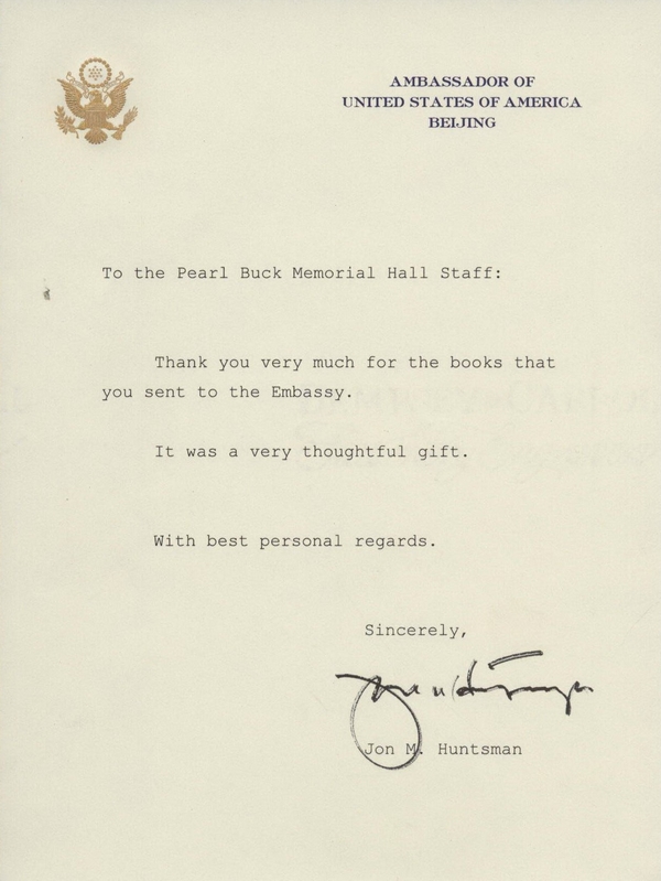 今天早晨,刚举行完赛珍珠年会的纪念馆名誉馆长纪东收到了一份特快专递。这份由美国使馆礼宾处发来的快件中,内有美国大使Jon M.Huntsman(中文名洪博培)用英文亲笔签名的给纪念馆全体人员的一封信。信中洪博培大使感谢赛珍珠纪念馆一个多月前寄送的有镇江赛珍珠研究会组织人编写的《文化人桥——赛珍珠》一书,称其为有深刻意义的礼物。洪大使并对纪念馆全体工作人员表达了亲切的问候。上任后首次来江苏访问的洪博培大使本月2日在南京市参观“中美交往中的南京记忆”图片展时,对赛珍珠为中美文化交流作出的贡献表示赞许。馆长李进法说,“在洪博培大使访问江苏返京后不久即致信市赛珍珠纪念馆,不难看出这位美国有名的‘中国通’对‘文化人桥’赛珍珠女士的生平贡献有了更为深刻的良好印象。”