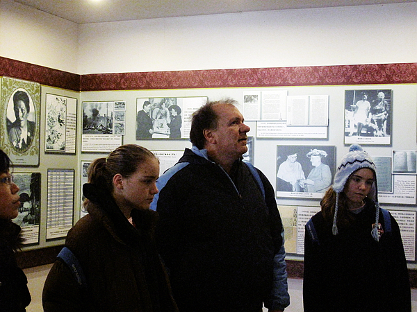 克伦修和他的三胞胎女儿(三胞胎中另一为儿子)在祖、父两代生活过的地方专注地参观赛珍珠纪念馆