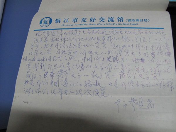 昨日,镇江赛珍珠研究会的同志陪同来访的赛珍珠国际总裁明泽一行到访赛珍珠崇拜的孔子故里,曲阜一位老人陈墨翰了解了赛珍珠的事迹和镇江的相关活动后,当场吟诵并书写嵌入赛珍珠名字的藏头诗留存赛珍珠纪念馆:赛君贤娇丛中笑,珍懿天资世称桥。珠光璀璨人赞之,才博识广女中豪。