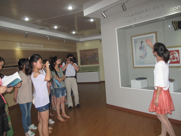 为增加大学生们对这位女杰的了解,提升旅游服务技能,来自镇江高专旅游系、外语系的学生在纪念馆丰富的馆藏前,举行了讲解比赛。他们在学校经过多轮选拔比赛,今天8名优秀选手分别用中英文作了流畅、精彩的布展讲演。不同的声音共同表达了对镇江女儿、杰出女杰的钦敬之情。讲解比赛后,同学们又兴致勃勃地观看了馆藏电影、当今热播的赛珍珠抗战题材神剧——《龙子》。随后举行了颁奖。三名优秀选手获颁纪念馆精心制作的纪念品。