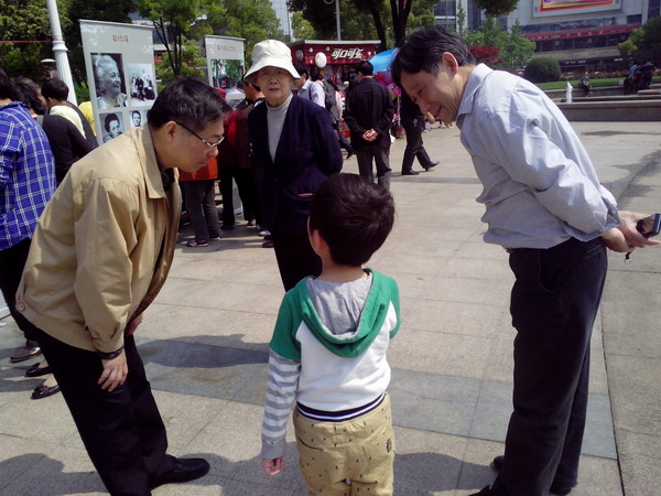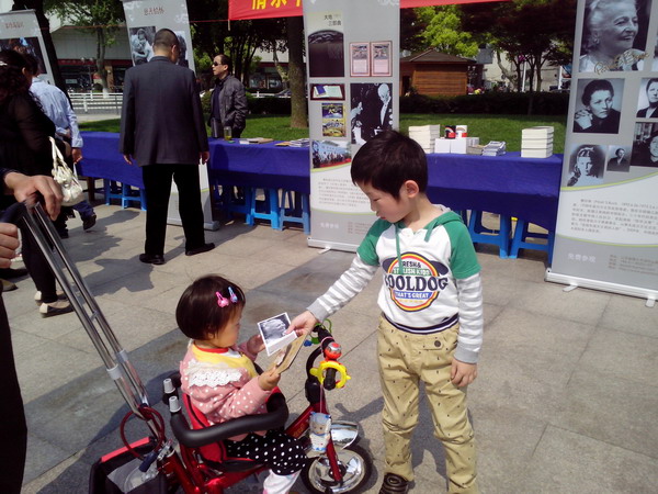 老少齐上阵,宣传赛珍珠 研究会会长许晓霞和小志愿者在广场